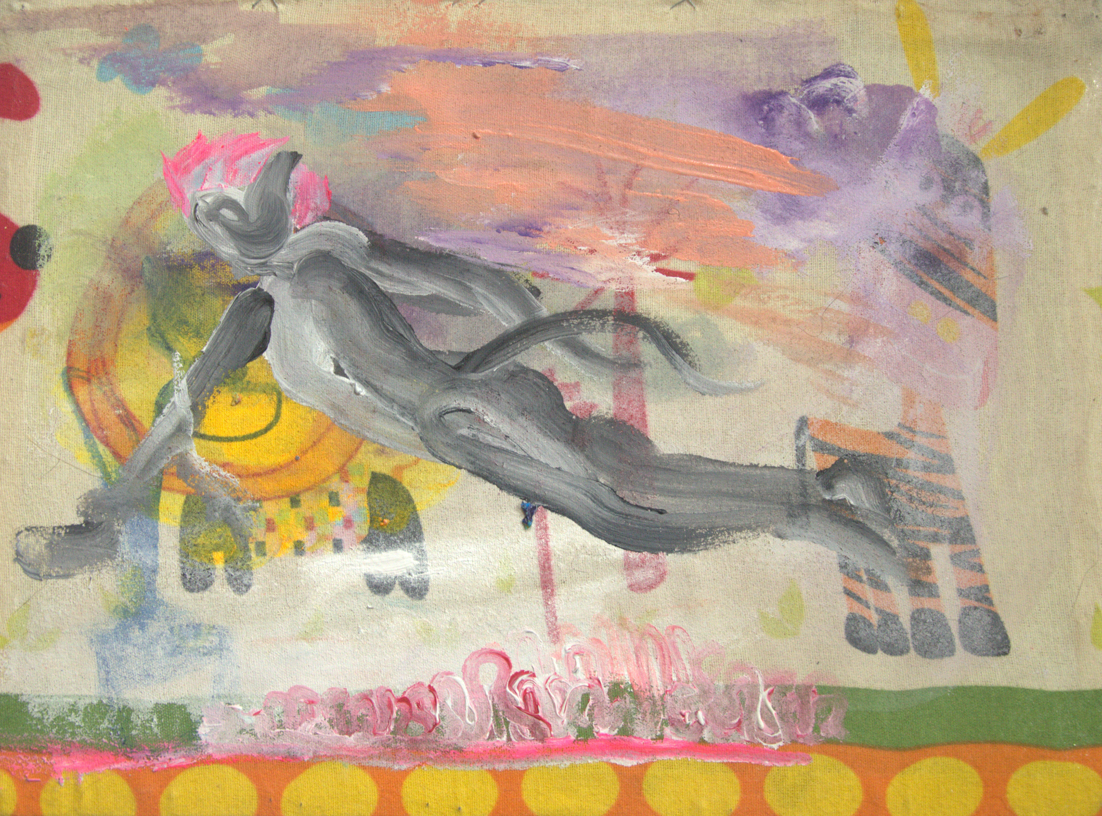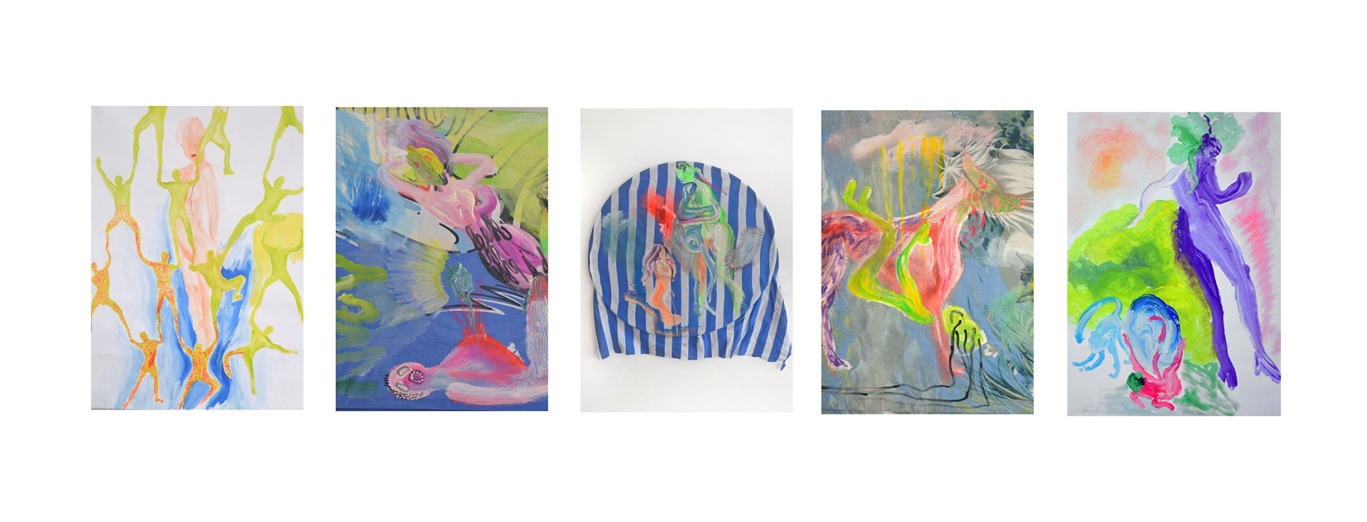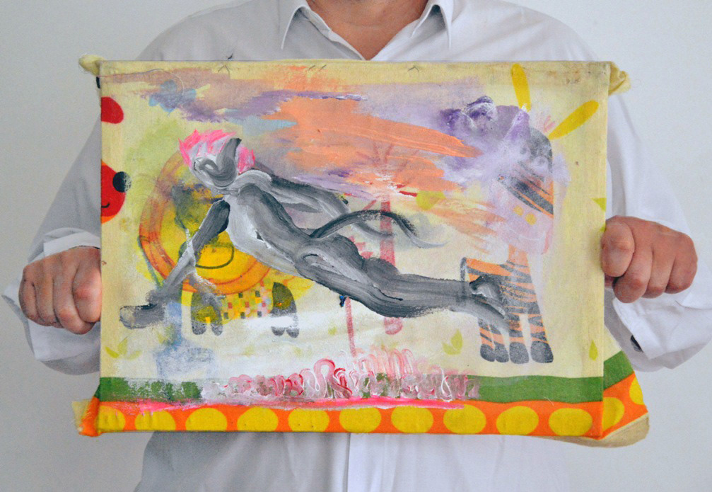 In this work I am trying to recreate the conditions of incubation, of the earliest emerging instincts. I am evoking the period of childhood and trying to engage in its aura. I am looking for a means which was once giving me a sense of security. Wrapping me up. Soaking up the sweat from my dreams. Onto the looms, pulled together like kites, I put children’s bed linen. Each one has a different pattern, different degree of wear, different smell. I am painting with diluted acrylic paint, trying to imitate child’s sweat, light and candylike. Through the subject of these works I am also trying to get to the origins. To the elementary matters. Following the path of C.G. Jung, I am trying to touch the archetypes with my own mind. These images are evidence of my psychoanalysis. Visionary centaurs, hippogriffs, manticores, chimeras and rainbow snakes are glittering, transforming, even eating themselves and defecating. They come from ancient mythologies and fables of primitive cultures. The scenes presented here are allusions of collective psyche. Step by step, I am approaching the misty and dark materia prima. Ensuring, at the same time, that colour and lightness of the touch of paint stand in naive opposition to the issues I bring up.