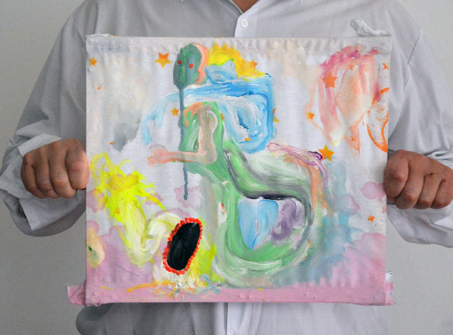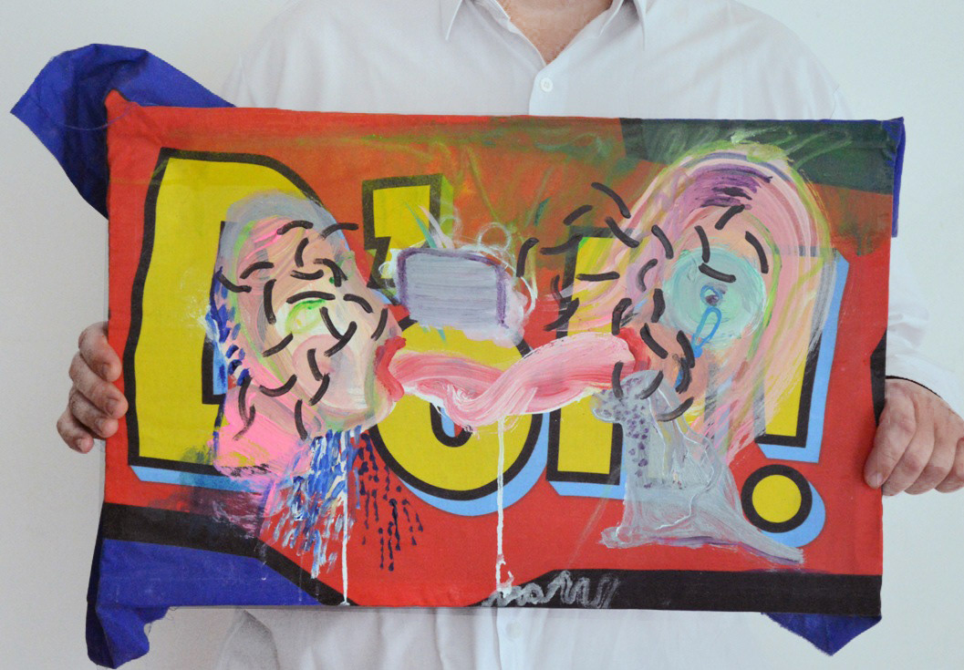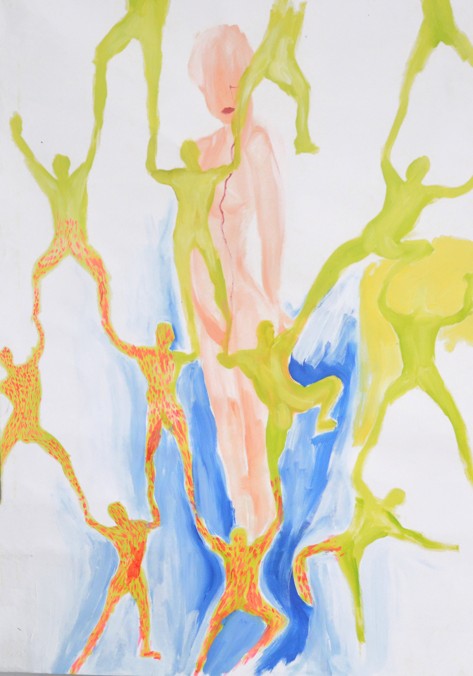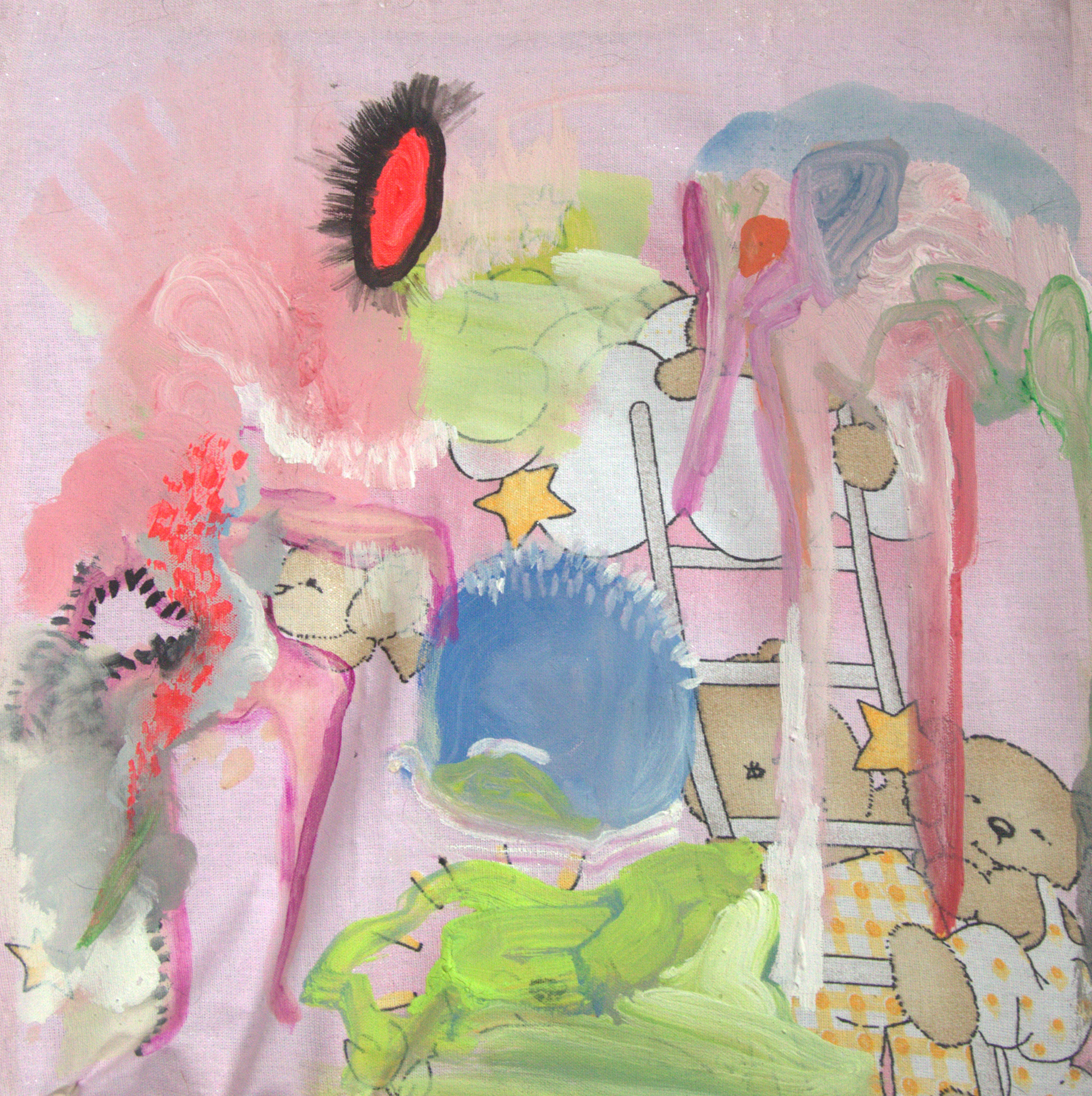In this work I am trying to recreate the conditions of incubation, of the earliest emerging instincts. I am evoking the period of childhood and trying to engage in its aura. I am looking for a means which was once giving me a sense of security. Wrapping me up. Soaking up the sweat from my dreams. Onto the looms, pulled together like kites, I put children’s bed linen. Each one has a different pattern, different degree of wear, different smell. I am painting with diluted acrylic paint, trying to imitate child’s sweat, light and candylike. Through the subject of these works I am also trying to get to the origins. To the elementary matters. Following the path of C.G. Jung, I am trying to touch the archetypes with my own mind. These images are evidence of my psychoanalysis. Visionary centaurs, hippogriffs, manticores, chimeras and rainbow snakes are glittering, transforming, even eating themselves and defecating. They come from ancient mythologies and fables of primitive cultures. The scenes presented here are allusions of collective psyche. Step by step, I am approaching the misty and dark materia prima. Ensuring, at the same time, that colour and lightness of the touch of paint stand in naive opposition to the issues I bring up.